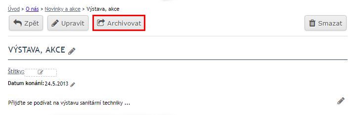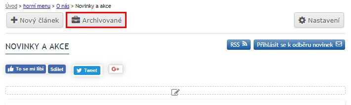 V přehledu aktualit se Vám nově zobrazí tlačítko 'Archivované', které není pro návštěvníka viditelné. Po kliknutí se objeví seznam všech archivovaných aktualit.