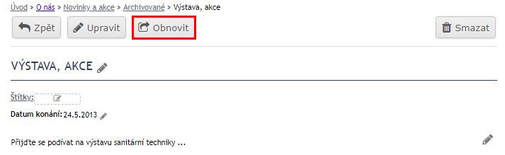 Aktualitu můžete vrátit zpět k nearchivovaným kliknutím na tlačítko 'Obnovit'.