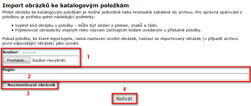 Hromadně můžete ke katalogovým položkám nahrát obrázky. Stačí když se budou názvy obrázků shodovat s položkou .csv souboru 'obrázky' (při celkovém exportu se jedná o sloupec G). Více obrázků u jednoho produktu můžete oddělit pomocí svislé čáry "obrázek1|obrázek2".