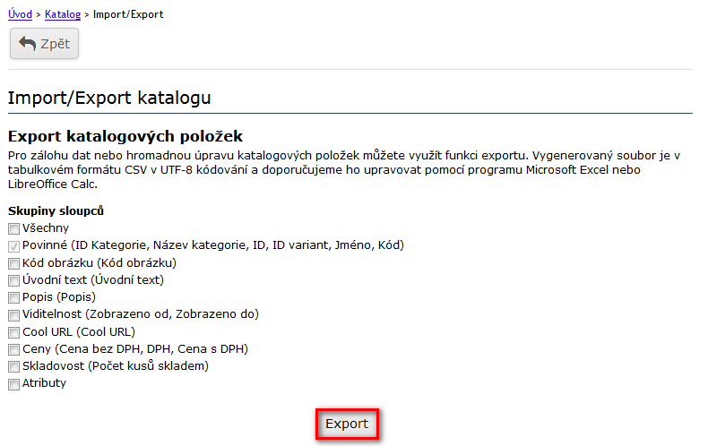 Vygenerovaný soubor je ve formátu .csv s použitým kódováním UTF-8. O jeho úpravě se můžete dočíst zde.