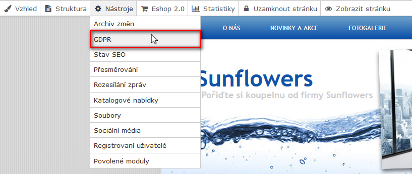 2) Na vrchní nástrojové liště vyberte 'Nástroje' -> 'GDPR'