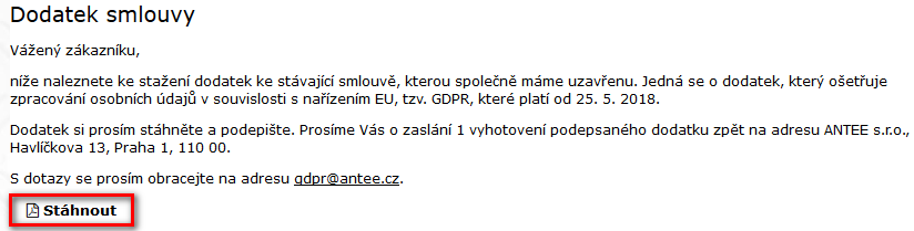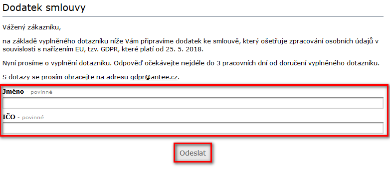 V případě, že dodatek není k dispozici vyplňte 'Jméno', 'IČO' a stikněte tlačítko 'Odeslat'. Nejpozději do 3 pracovních dnů dodatek vytvoříme.