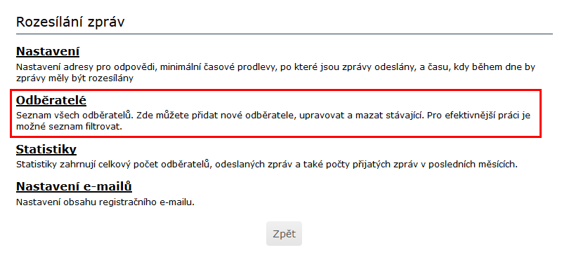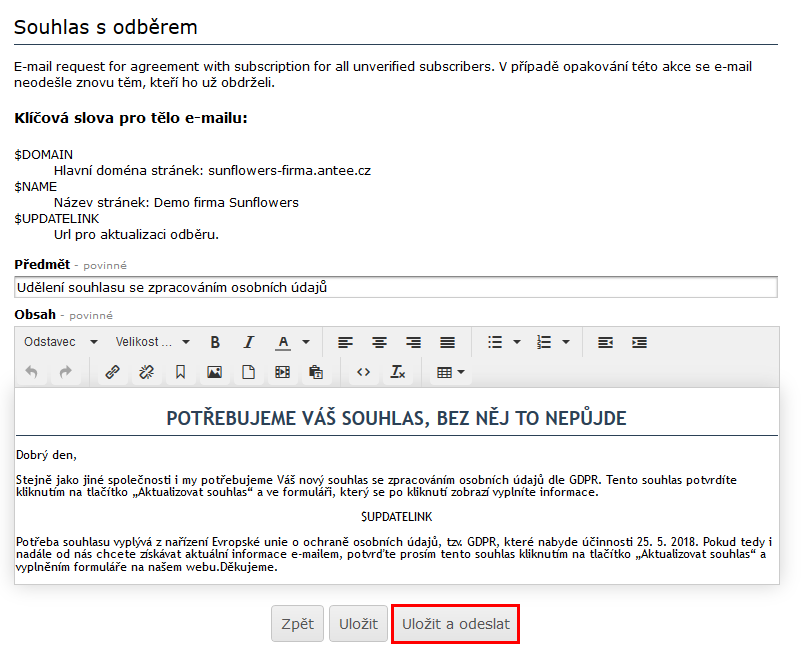5) Zde můžete upravit text aktuality, která bude zaslána všem neverifikovaným odběratelům po stisknutí tlačítka 'Uložit a odeslat'