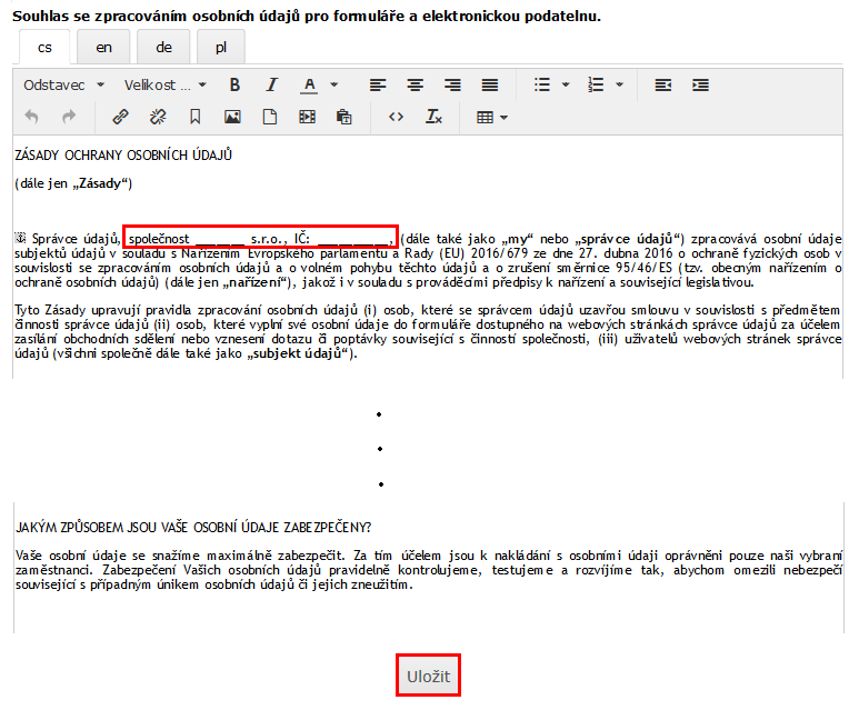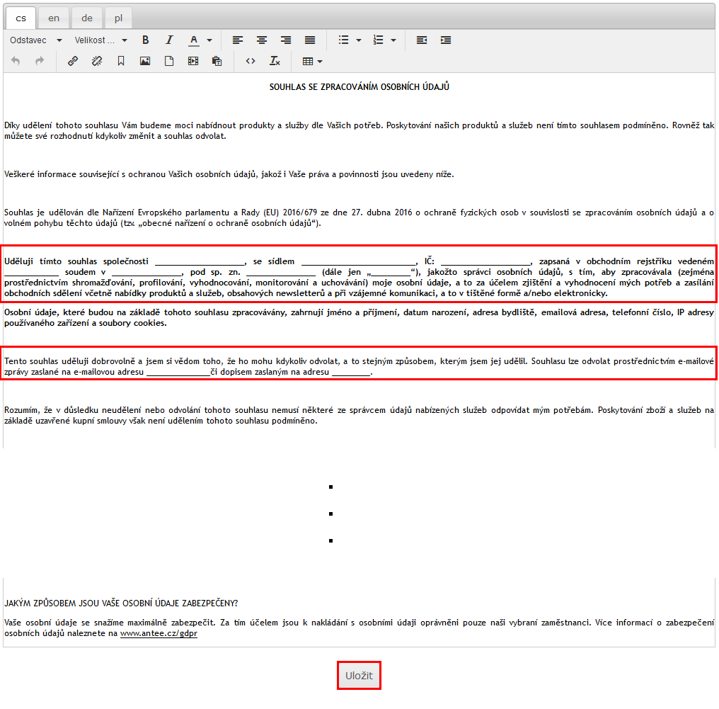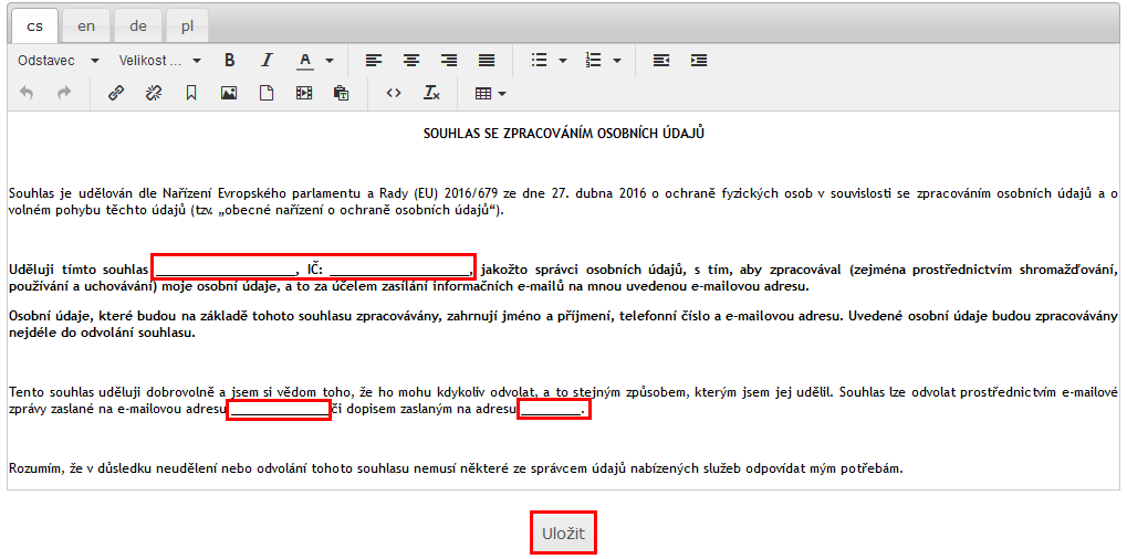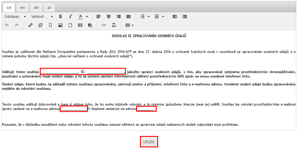 3) Níže na straně naleznete šablony souhlasů se zpracováním osobních údajů. Prosíme o vyplnění všech potřebných údajů. Veškeré změny potvrďte stisknutím tlačítka 'Uložit'.