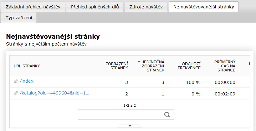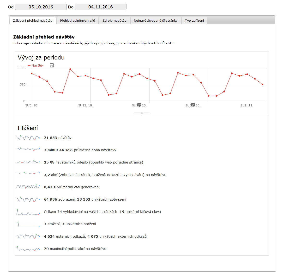 Zobrazuje základní informace o návštěvách, jejich vývoj v čase, procento okamžitých odchodů atd.