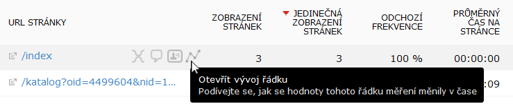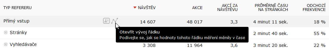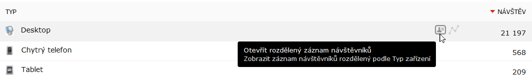 Najetím kurzoru na ikonku 'Rozdělený záznam návštěvníků' a 'Vývoj řádku' zobrazíte další podrobnosti.