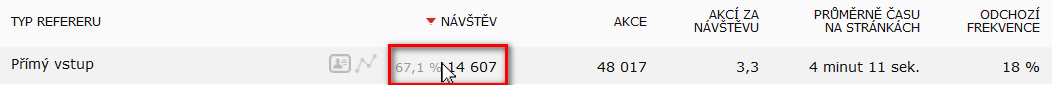 Najetím kurzoru před počet návštěv se zobrazí procentuální rozvržení návštěv.