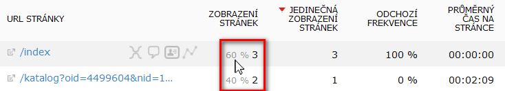 Najetím kurzoru před počet zobrazení stránek se zobrazí procentuální rozvržení zobrazení.