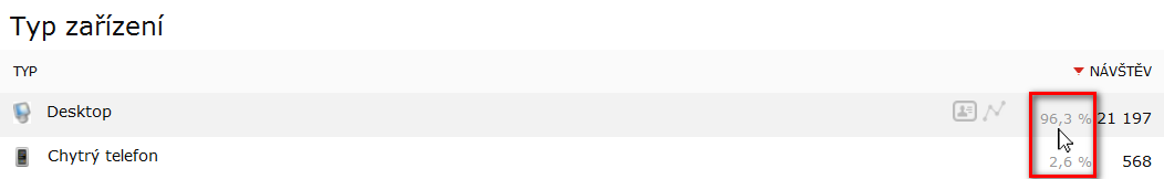 Najetím kurzoru před počet návštěv se zobrazí procentuální rozvržení.
