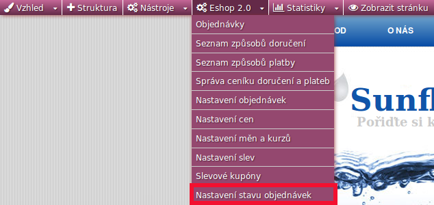 2) Na vrchní nástrojové liště vyberte 'E-shop 2.0' -> 'Nastavení stavů objednávek'