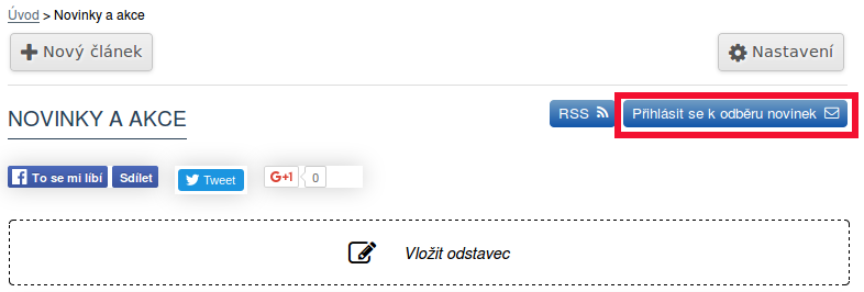 Povolit přihlášení k odběru - Je-li zaškrtnuto, návštěvníci mají možnost přihlásit se k odběru aktualit.