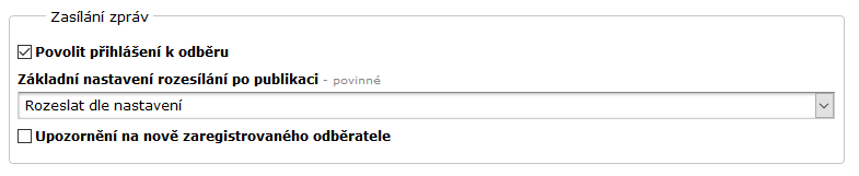 Základní nastavení rozsílání po publikaci - Rozeslání nového článku bude provedno podle nastavení rozesílání aktualit, článek je možné rozeslat ihned nebo vůbec.