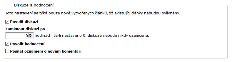 Povolit diskuzi, Zamknout diskuzi po, Povolit hodnocení - Výchozí nastavení pro tvorbu nových článků.