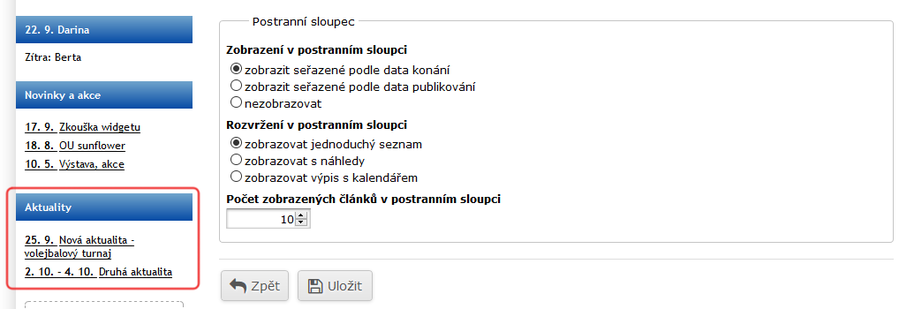 Změna nastavení se projeví na zobrazení aktualit ve sloupci.