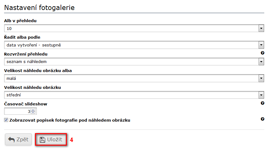 - Alb v přehledu - počet alb, která se zobrazí v přehledu fotogalerii zobrazí