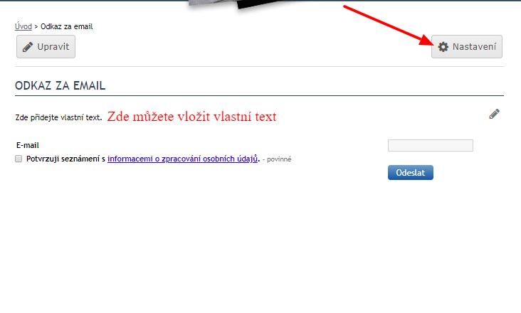 2) Upravíte text který se zobrazí na stránce, a kliknete na tlačítko nastavení.