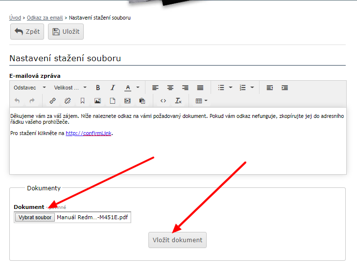 3) V posledním kroku již jen přidáte soubor, který přijde emailem vašemu klientovi. A potvrdíte tlačítkem "vložit soubor".
