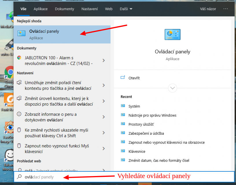 2) V nabídce start vyhledejte ovládací panely a klikněte na ně.