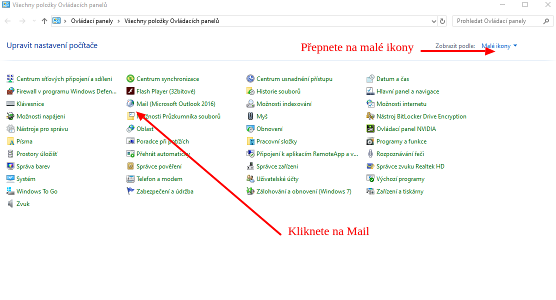 3) V ovládacích panelech si přepnete do malých ikon a najdete ikonu Mail (Microsoft Outlook)