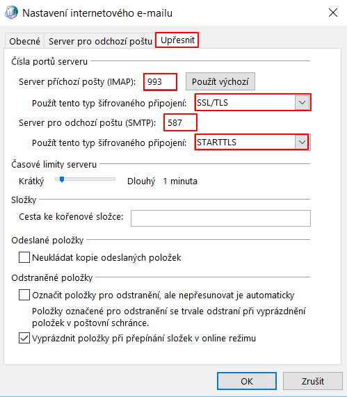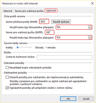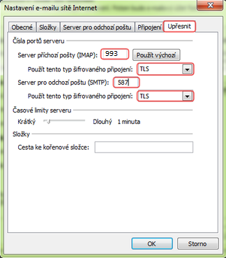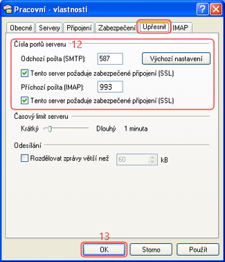 12) Přejděte na záložku 'Upřesnit' a přepište čísla portů (u 993,995 a 587 zaškrtněte 'Tento server požaduje zabezpečené připojení (SSL)'):