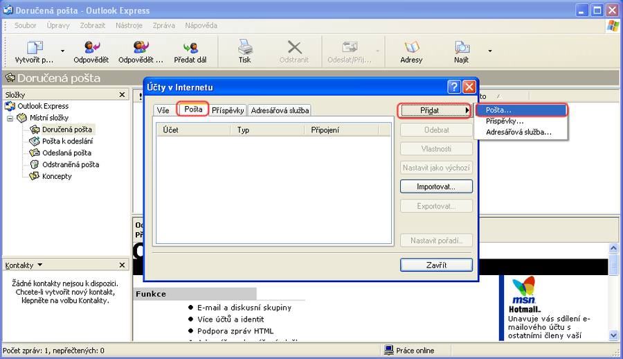 3) Zvolte záložku 'Pošta -> Přidat -> Pošta…'