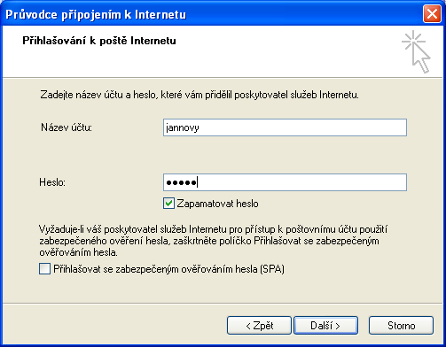 7) Vyplňte přihlašovací informace - uživatelské jméno a heslo dle infoletáku. Pokračujte tlačítkem 'Další'.