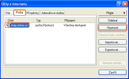9) Zvolte záložku 'Pošta' -> Vyberte váš e-mail -> 'Vlastnosti'