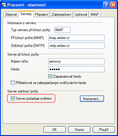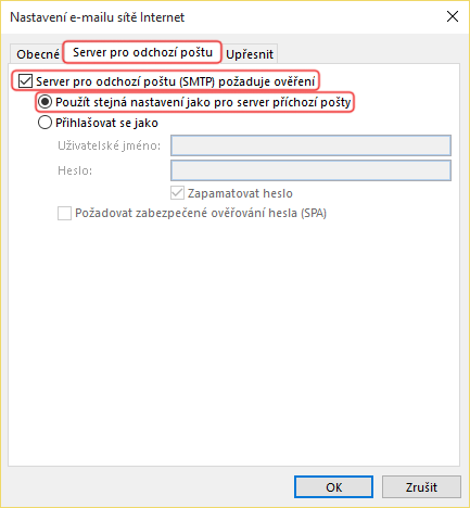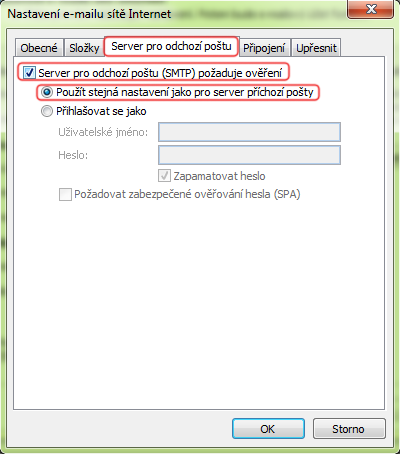 11) Přejděte na záložku 'Server pro odchozí poštu' a zaškrtněte 'Server pro odchozí poštu (SMTP) požaduje ověření' a ponechte 'Použít stejná nastavení jako pro server příchozí pošty'