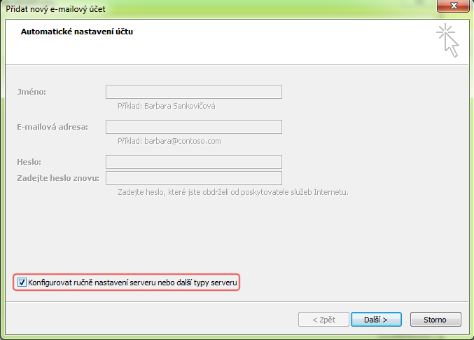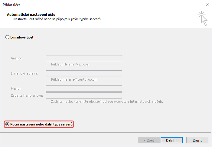 4) Zaškrtněte 'Ruční nastavení nebo další typy serverů' a klikněte na 'Další'