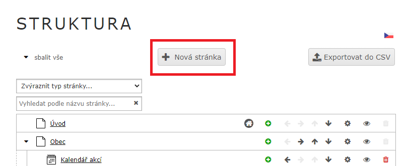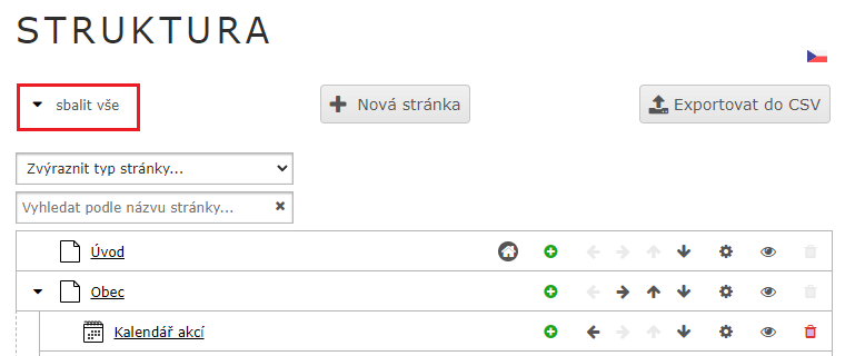 2) Po kliknutí SBALIT VŠE již vidíte opět strukturu bez podstránek.