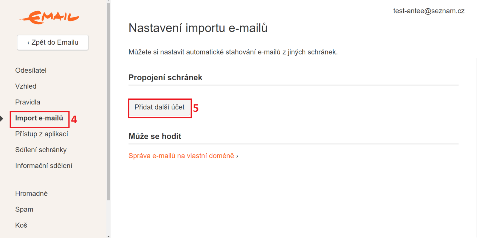 4) Z nabídky vyberte 'Import e-mailů' následně se Vám zobrazí 'Nastavení importu e-mailů'.