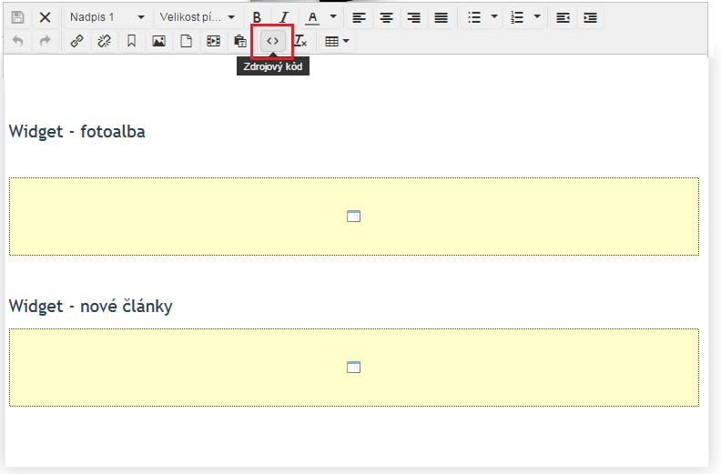 4) Widgety se v editoru zobrazují jako oranžová okna s červeným okrajem. Pro jejich úpravu klikněte na ikonu dvou šipek, která upravuje zdrojový kód.