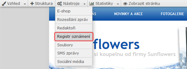 2) Na vrchní nástrojové liště vyberte 'Nástroje' -> 'Registr oznámení'
