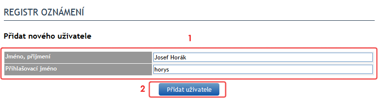 Vyplňte textová pole (1) a stiskněte tlačítko 'Přidat uživatele' (2).