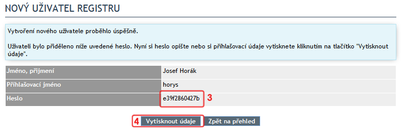 Následně bude tomuto uživateli vytvořeno automaticky heslo (3). Systém doporučuje tyto údaje vytisknout (4) či opsat.