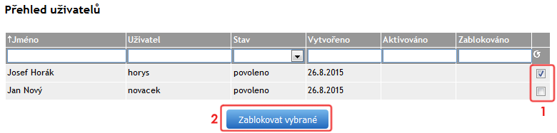 V přehledu zákazníků zaškrtněte pole u uživatele(ů), kterého chcete zablokovat (1). Tlačítkem 'Zablokovat vybrané' (2) změnu provedete.