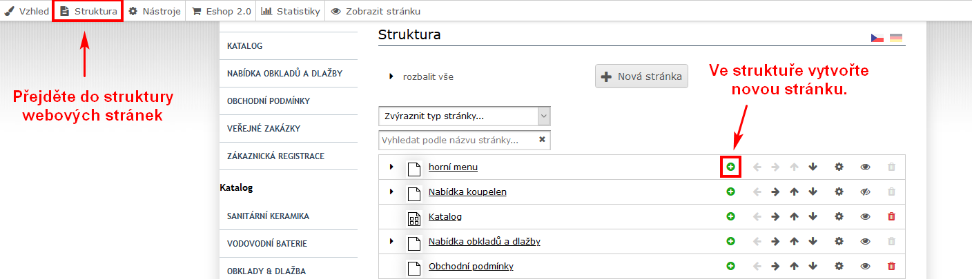 1) Na vrchní nástrojové liště vyberte 'Struktura' a vytvořte novou stránku.