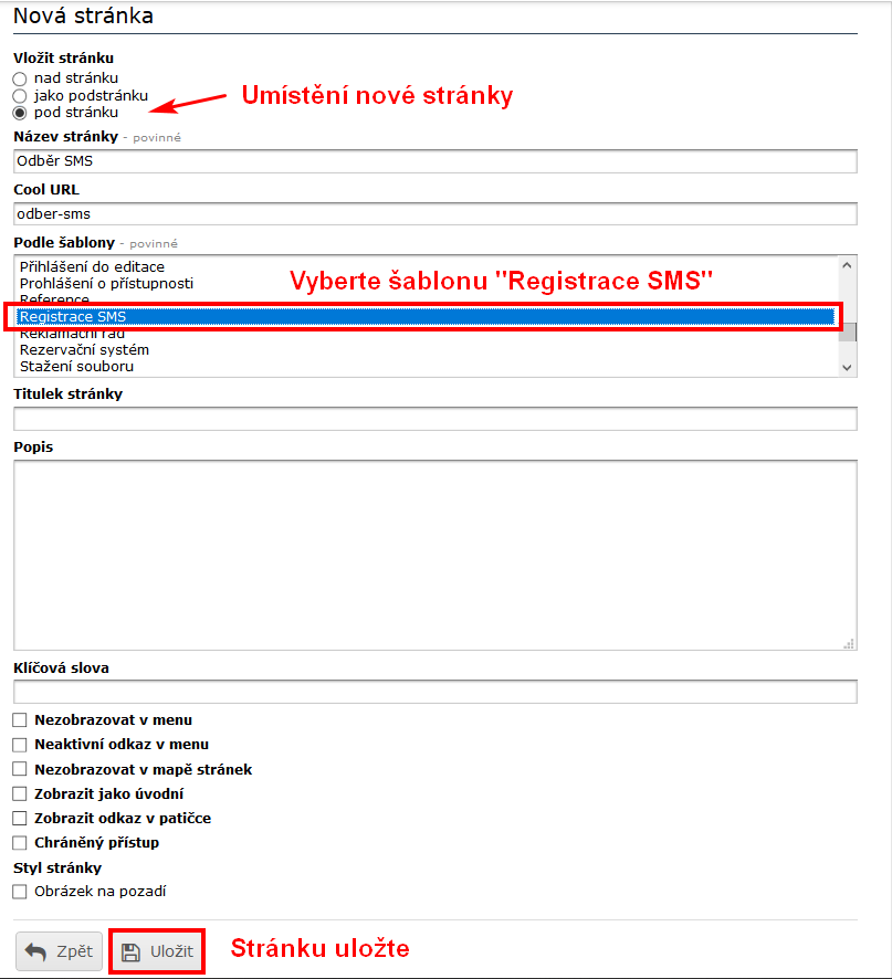 2) Stránku vytvořte podle šablony "Registrace SMS"