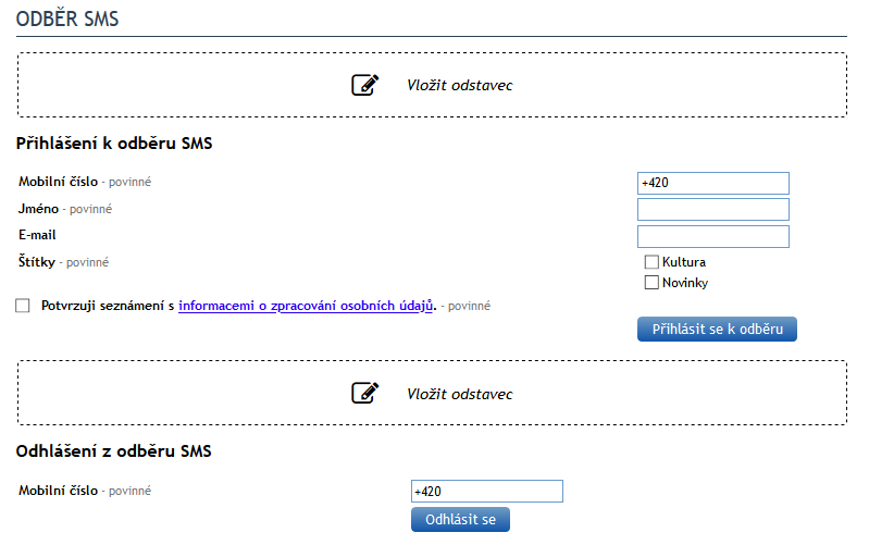 3) Na nově vytvořené stránce se mohou uživatelé registrovat k odběru SMS zpráv. Na stránce je možné doplnit libovolný text.