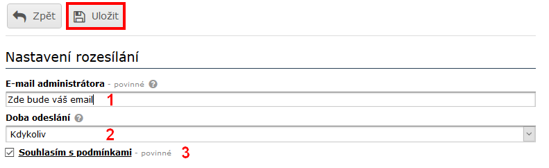 V nastavení naleznete e-mail administrátora (1), možnost nastavení doby rozesílání SMS zpráv (2) a podmínky používání služby (3). Změny potdvrdíte tlačítkem 'Uložit' .