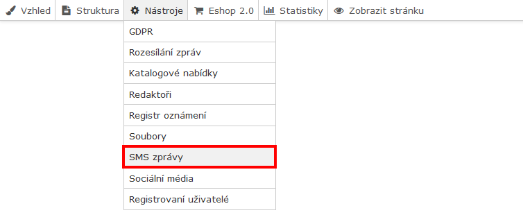 Na vrchní nástrojové liště vyberte 'Nástroje' -> 'SMS zprávy'