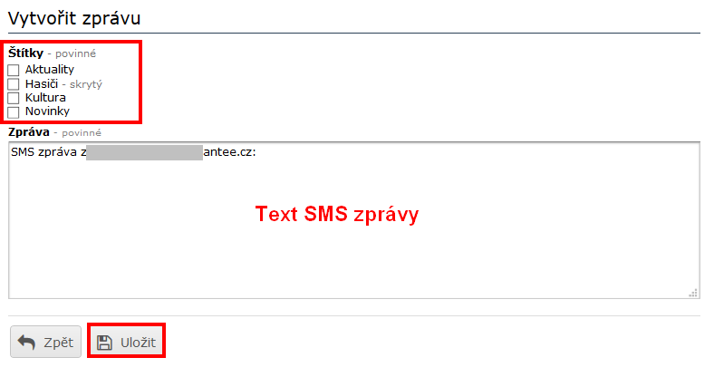 Před psaním vyberte jakých štítků (témat) se SMS týká. Dále vyplňte text SMS zprávy. Jako pomocník poslouží počet zbývajících znaků do další SMS. SMS připravíte stisknutí tlačítka 'Uložit' .