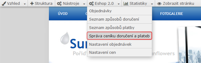 2) Na vrchní nástrojové liště vyberte 'E-shop 2.0' -> 'Správa ceníku doručení a plateb'