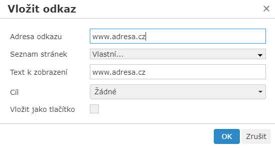 Adresa odkazu: Zadáváte adresu - tedy cíl, který se nachází na jiných stránkách