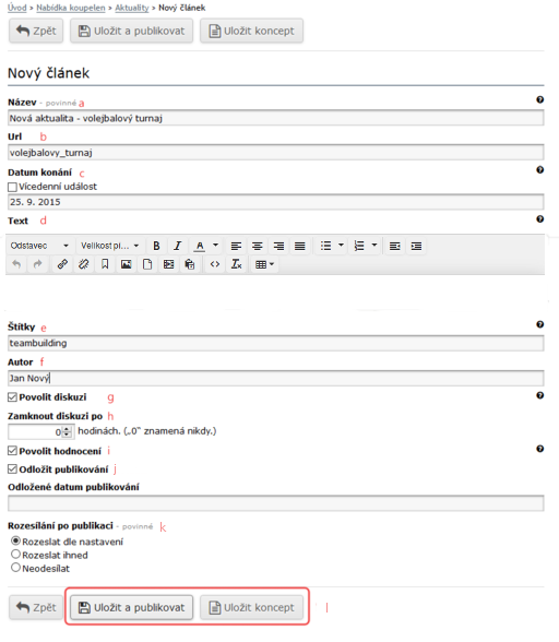 - Uložit a publikovat - Uloží článek a publikuje podle nastavení aktualit pro návštěvníky, nebo 'Uložit koncept' - článek je uložen do Konceptů a publikovat ho je možné později.