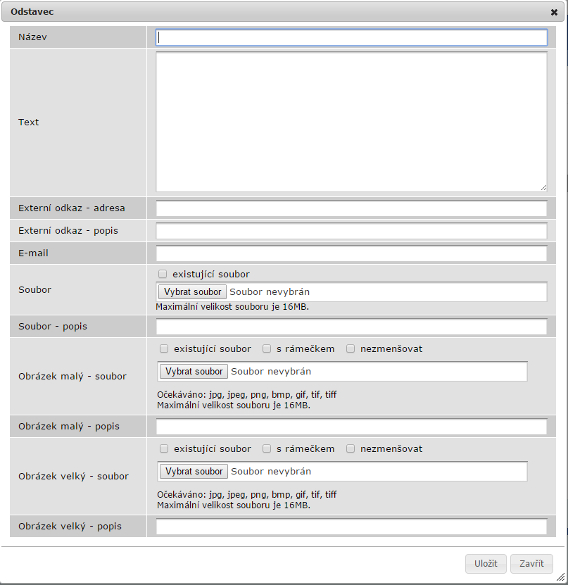 3) Vyplňte formulář, můžete vložit Název, text, soubor, obrázek a popis obrázku.