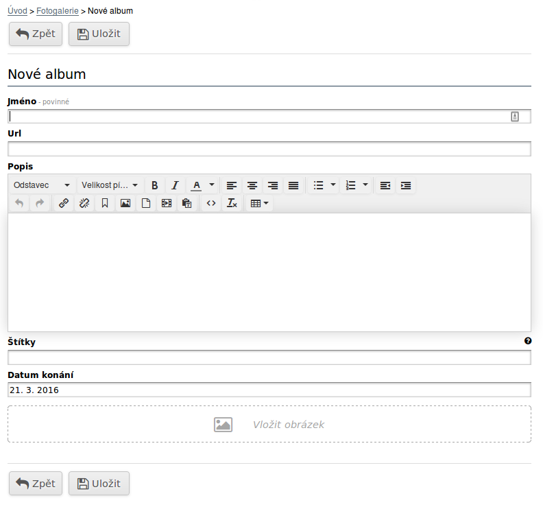 Štítky - lze nastavit libovolné štítky, podle kterých může návštěvník stránek filtrovat fotoalba v stránce Fotogalerie. Jedno fotoalbum může mít i více štítků, stačí je oddělit čárkou.