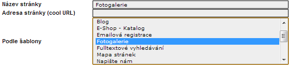 Kliknutím na tlačítko 'Vložit stránku' zobrazíte okno založení nové stránky. Zde vyberte šablonu 'Fotogalerie', vyplňte 'Název stránky' a 'Adresa stránky'. Nakonec vše potvrďte kliknutím na tlačítko 'Vložit'.