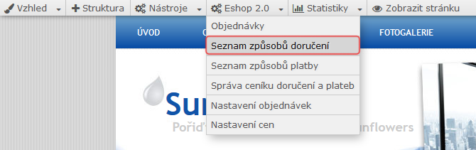 2) Na vrchní nástrojové liště vyberte 'E-shop 2.0' -> 'Seznam způsobů doručení'