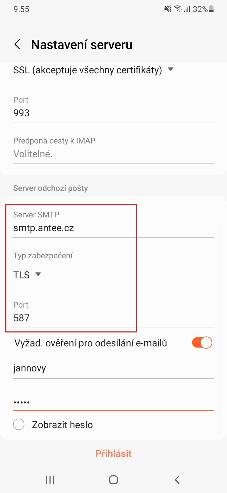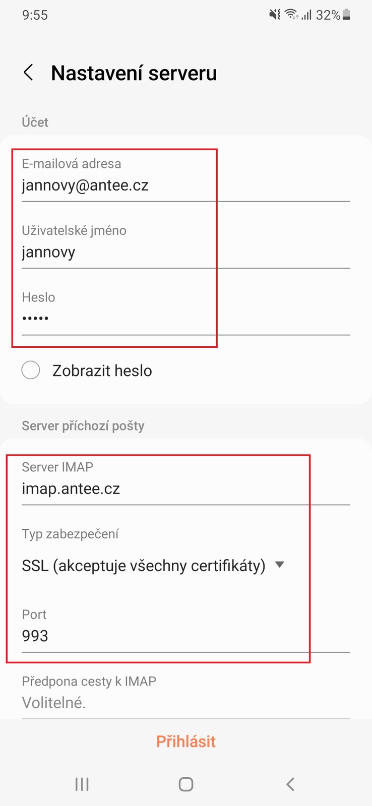 a) Server příchozí pošty (server IMAP) vyplňte následovně: